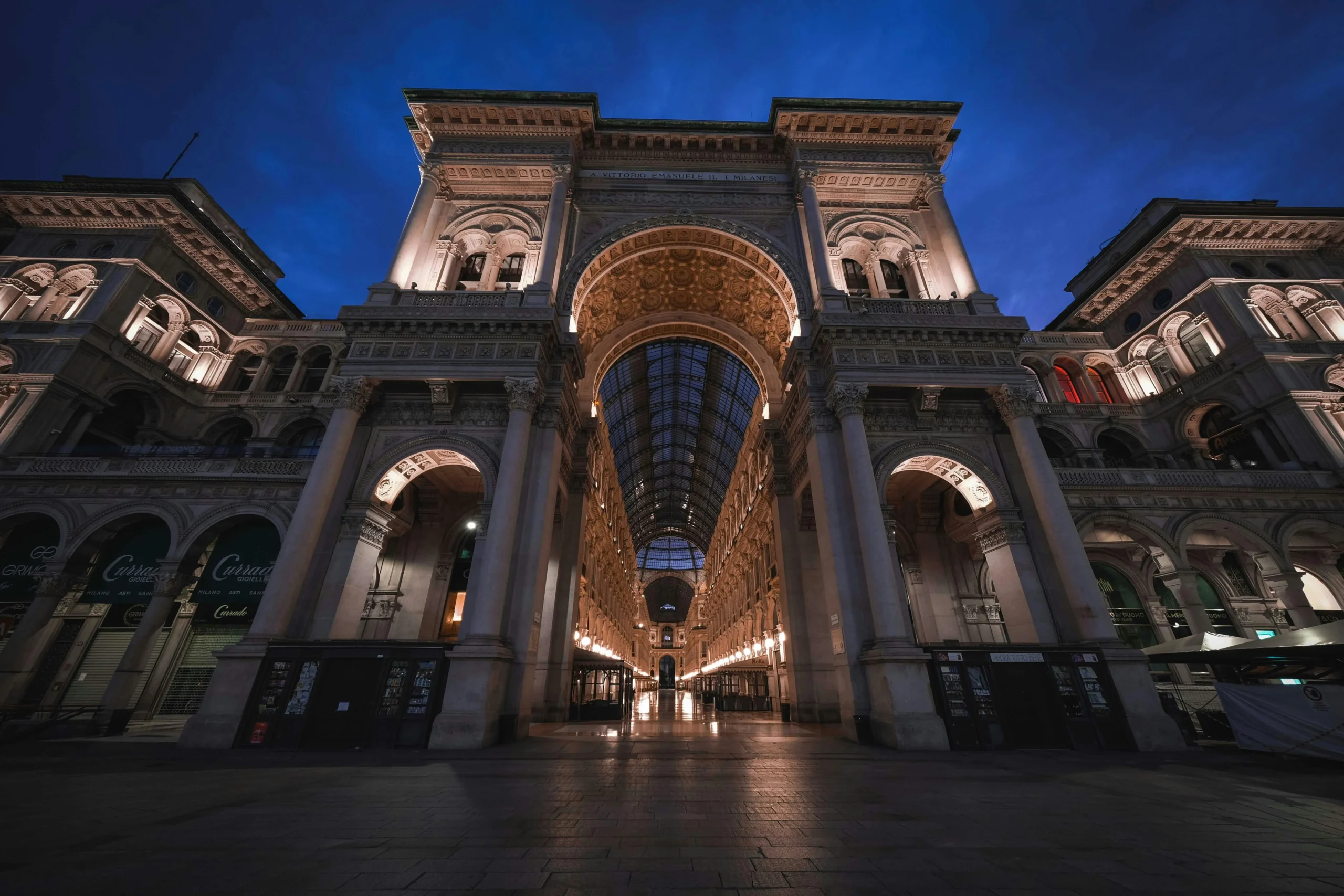 A few words on Milan Galleria’s architectural structure. The main entrance, which overlooks Piazza del Duomo, has a structure that echoes that of a triumphal arch and, at the top, bears the inscription “To Vittorio Emanuele II. The Milanese”.