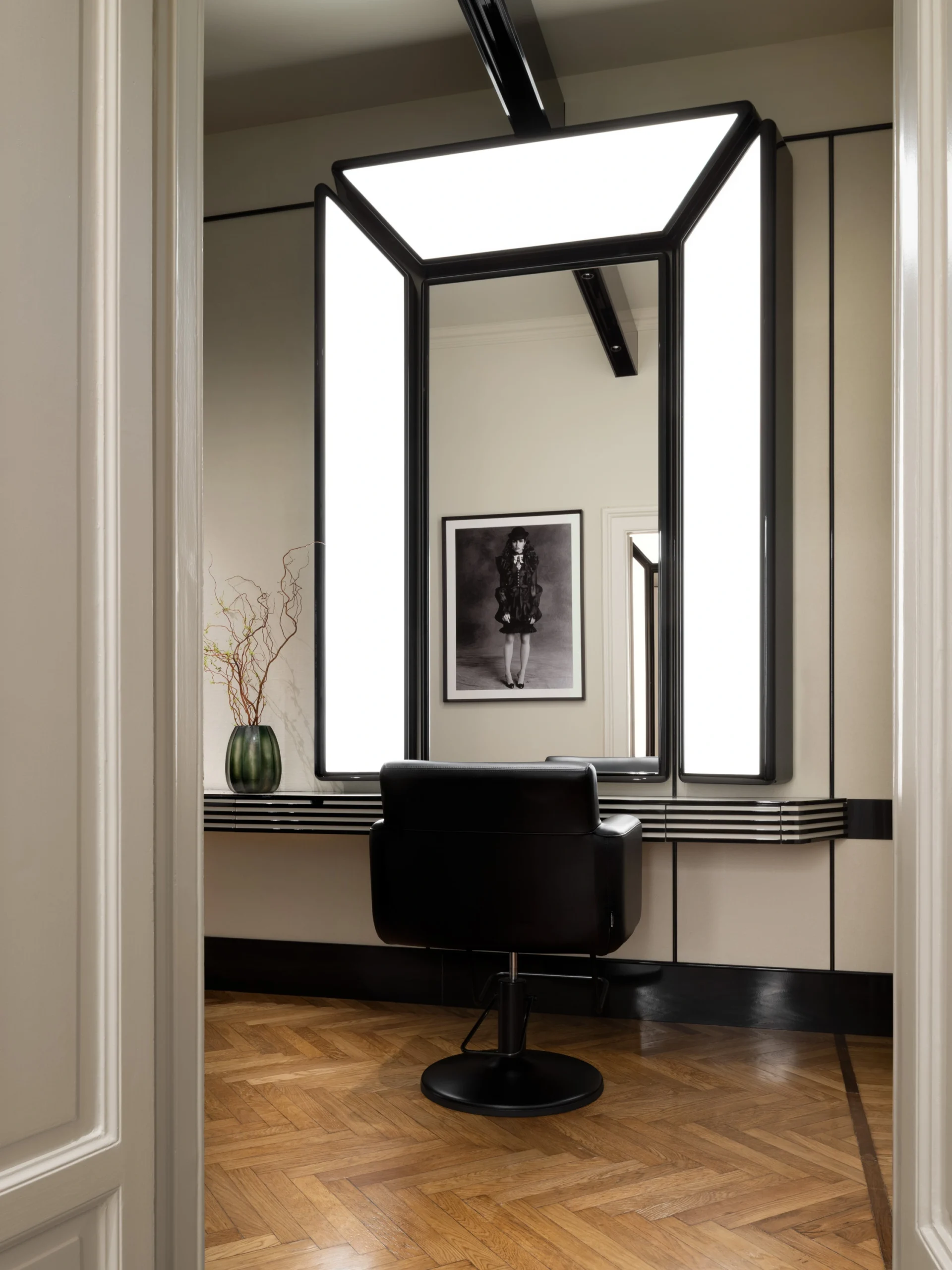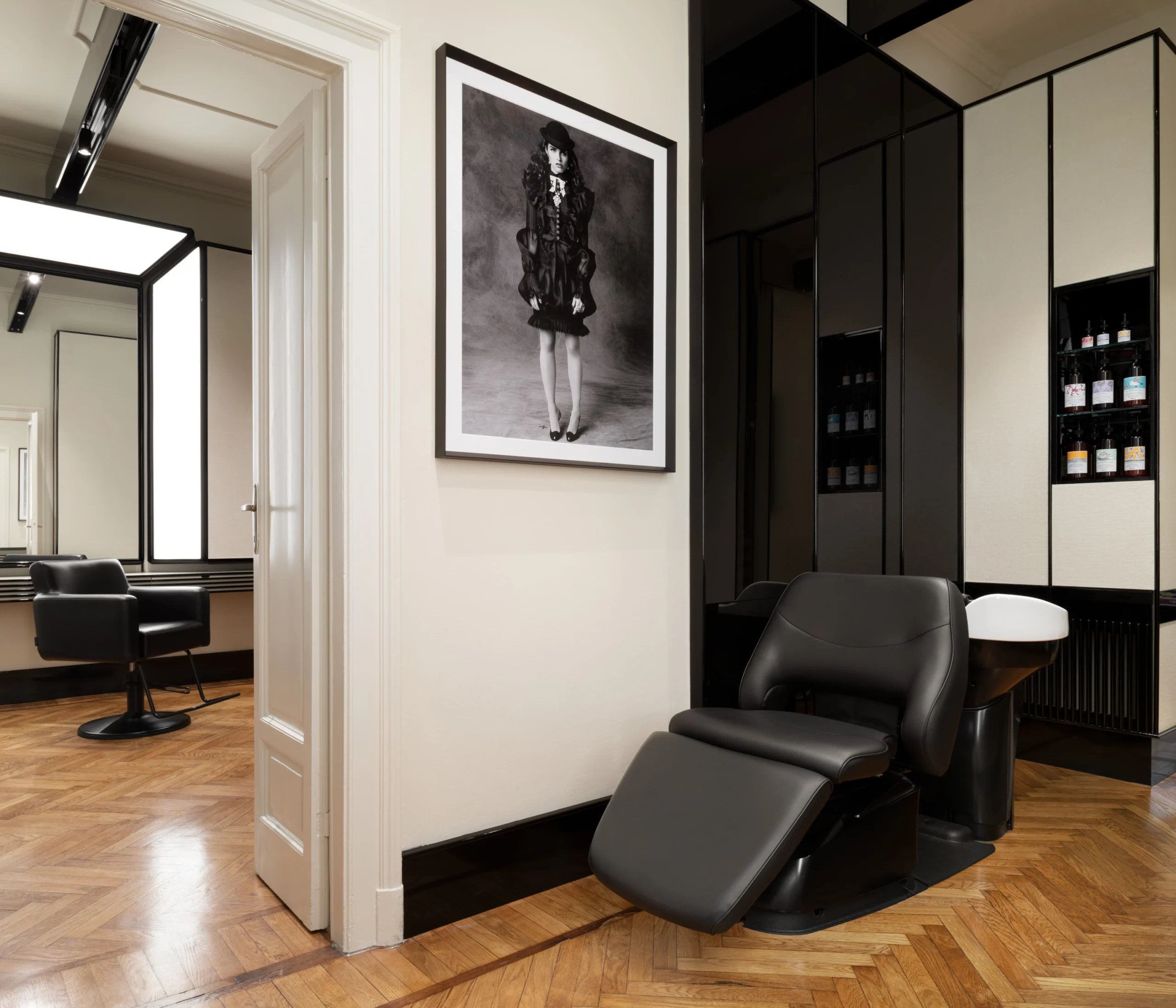 Since wellbeing is truly a multisensory experience, visual gratification also plays an important role. And that is why Davide Diodovich’s salon was created to enhance your relaxation. Inspired by the ateliers of the 1940s and the aesthetics of Andrée Putman, it is deliberately minimalist in its choice of just two contrasting colours and effects that blend perfectly: matt butter and glossy black.